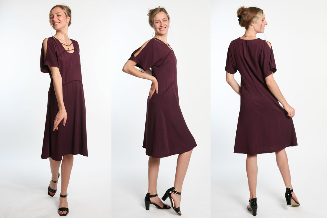Our summer dress Finola convinces with an unusual cut and beautiful details. The A-shaped dress casually swings slightly due to the flared hem. The oversized sleeves and the wide neckline sit nicely and loosely. The colored piping at hip and chest height are additional eye-catchers and emphasize the special lines.
