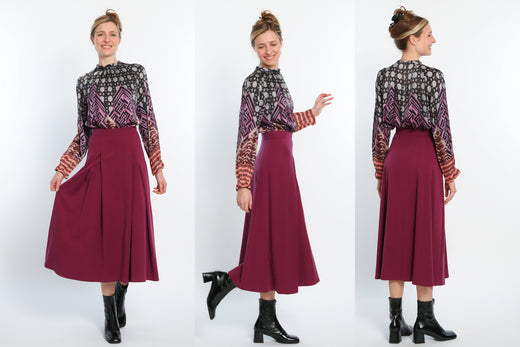 Der weit schwingende Midirock Vivien kleidet dich an kühlen Tagen ebenso wie in den sonnenreichen Monaten. Entsprechend gestylt, mit oder ohne Strumpfhose, Stiefel oder Sneaker, Vivien ist ein echtes Allround - Schnittmuster. Die gelegten Falten im Vorderteil werden ein Stück abgesteppt, dadurch fallen sie weich zum schwingenden Saum.