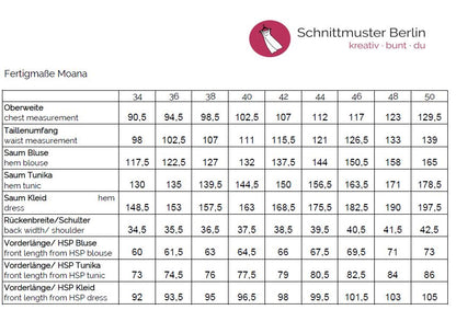 Mit dem Schnittmuster der Tunika Moana kannst du drei verschiedene Modelle nähen: die Bluse mit der kurzen Länge, die Tunika mit der mittleren Länge und das Kleid mit der kompletten Länge. Die unterschiedlichen Möglichkeiten sind im Schnitt eingezeichnet, du musst dich nur entscheiden. Moana ist ein sommerliches und leicht verspieltes Modell, der Saum ist ausgestellt, dadurch ergibt sich ein lässiger und lockerer Fall um deinen Körper. Die kurzen Ärmel sind leicht angepufft und der Brustabnäher sorgt trotz bequemer Lässigkeit für die richtige Passform. Der V-Ausschnitt und das Bindeband , welches aus dem hinteren Halsloch kommt, sind aber die eindeutigen Details die diese Tunika ausmachen. Das Band kannst du einfach hängen lassen oder verspielt zur Schleife binden.