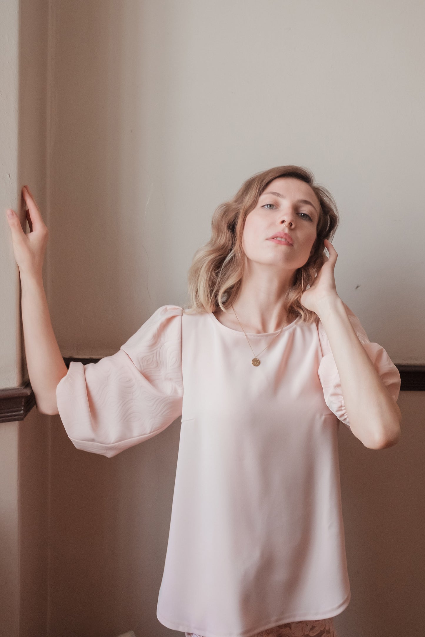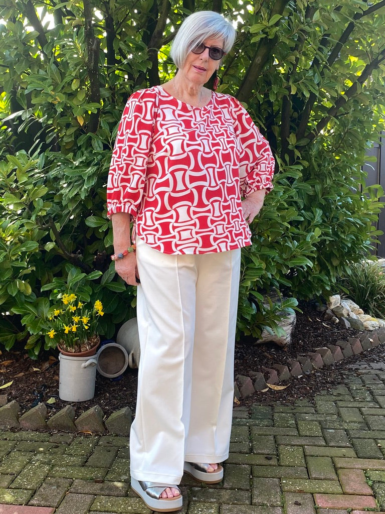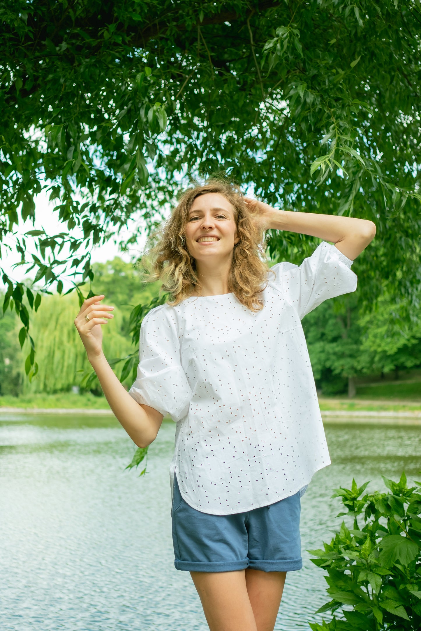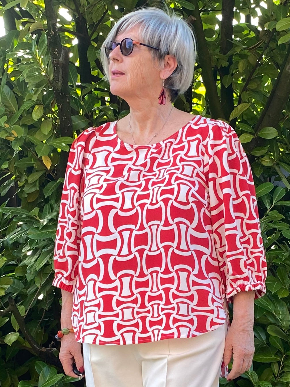 - Eine lockere, leichte Bluse mit einem großzügigen ovalen Ausschnitt – schön, bequem und feminin!