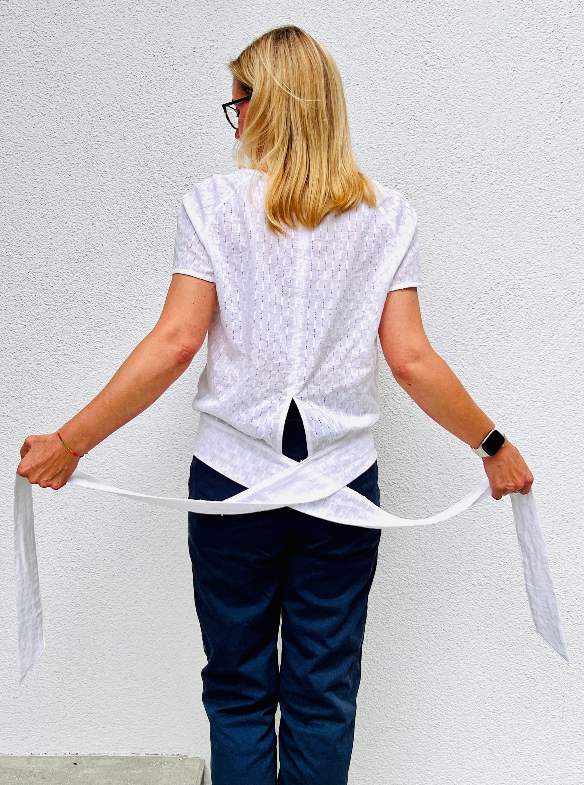 Ein besonderes Highlight ist das clevere Bindeband-System: Die hintere Mitte wird mit einer Naht geschlossen und verfügt über einen praktischen Schlitz zum Saum hin. Das breite Bündchen läuft in lange Bindebänder aus, die im Rücken beginnen und vorn gebunden werden. Durch den Rückenschlitz lässt sich das Band bequem auf deine Figur abstimmen und sorgt für eine individuelle Passform.
