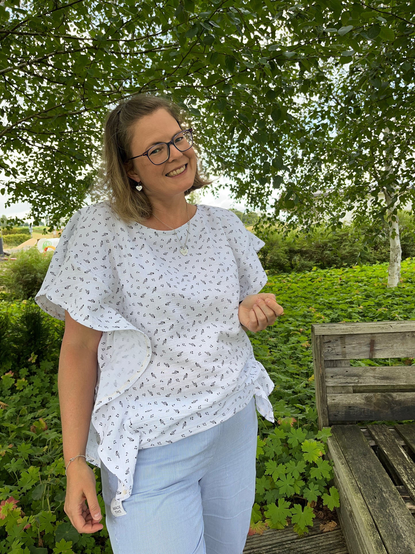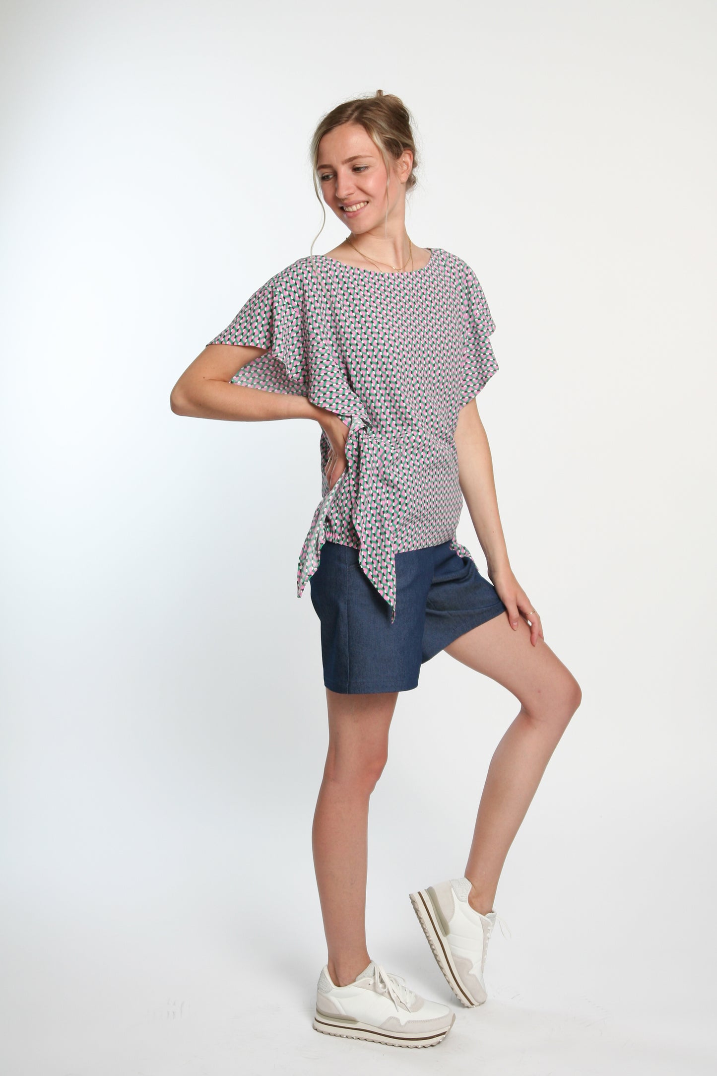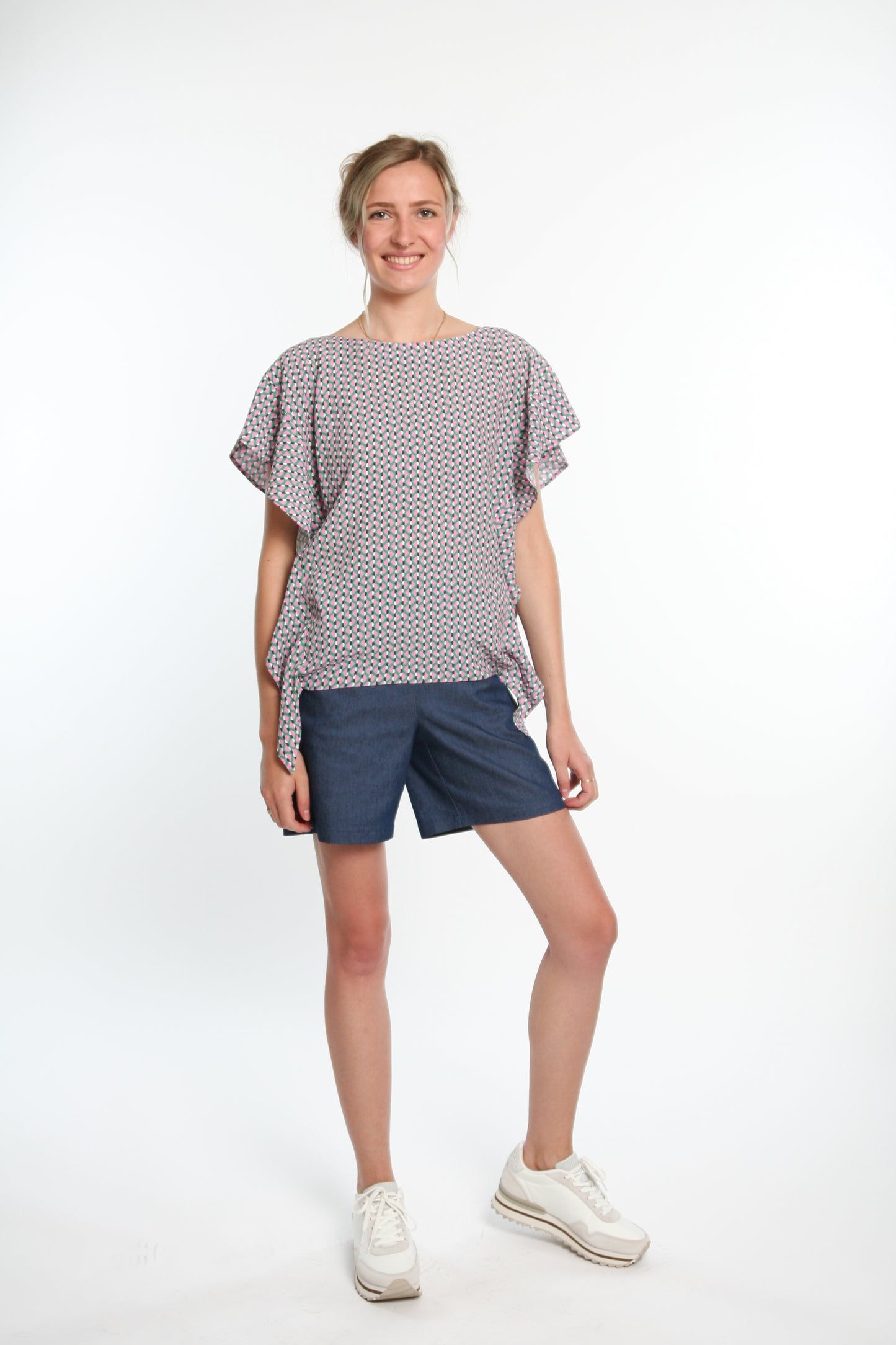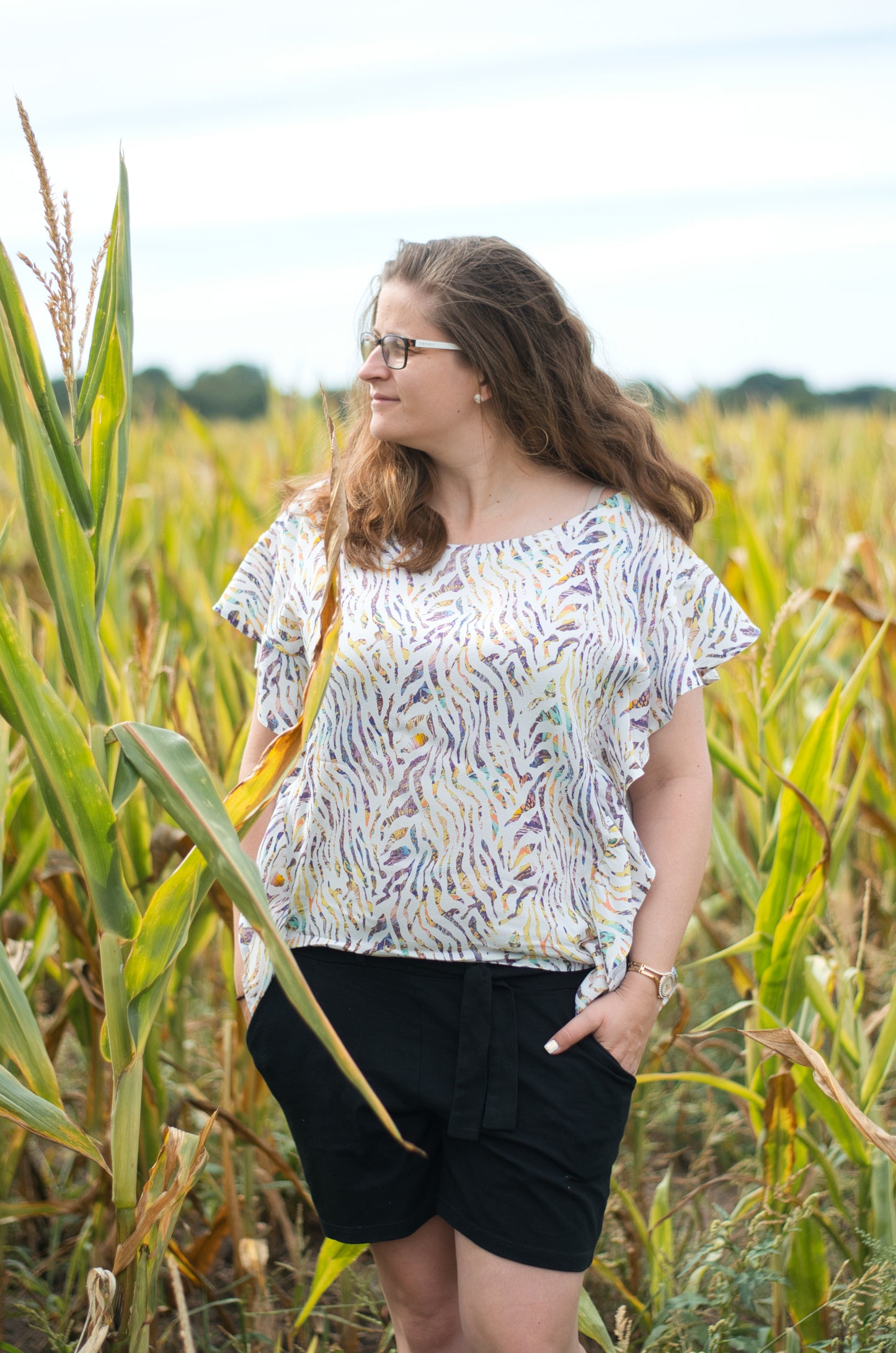 The Antonia T-shirt is easy to sew and therefore belongs in our " I'm still learning " category. The sophisticated cut gives the shirt a special look with a hippie character. The ruffle on the side covers the upper arm like a sleeve. The hem is gathered with the help of a narrow elastic band and thus ensures a good fit.