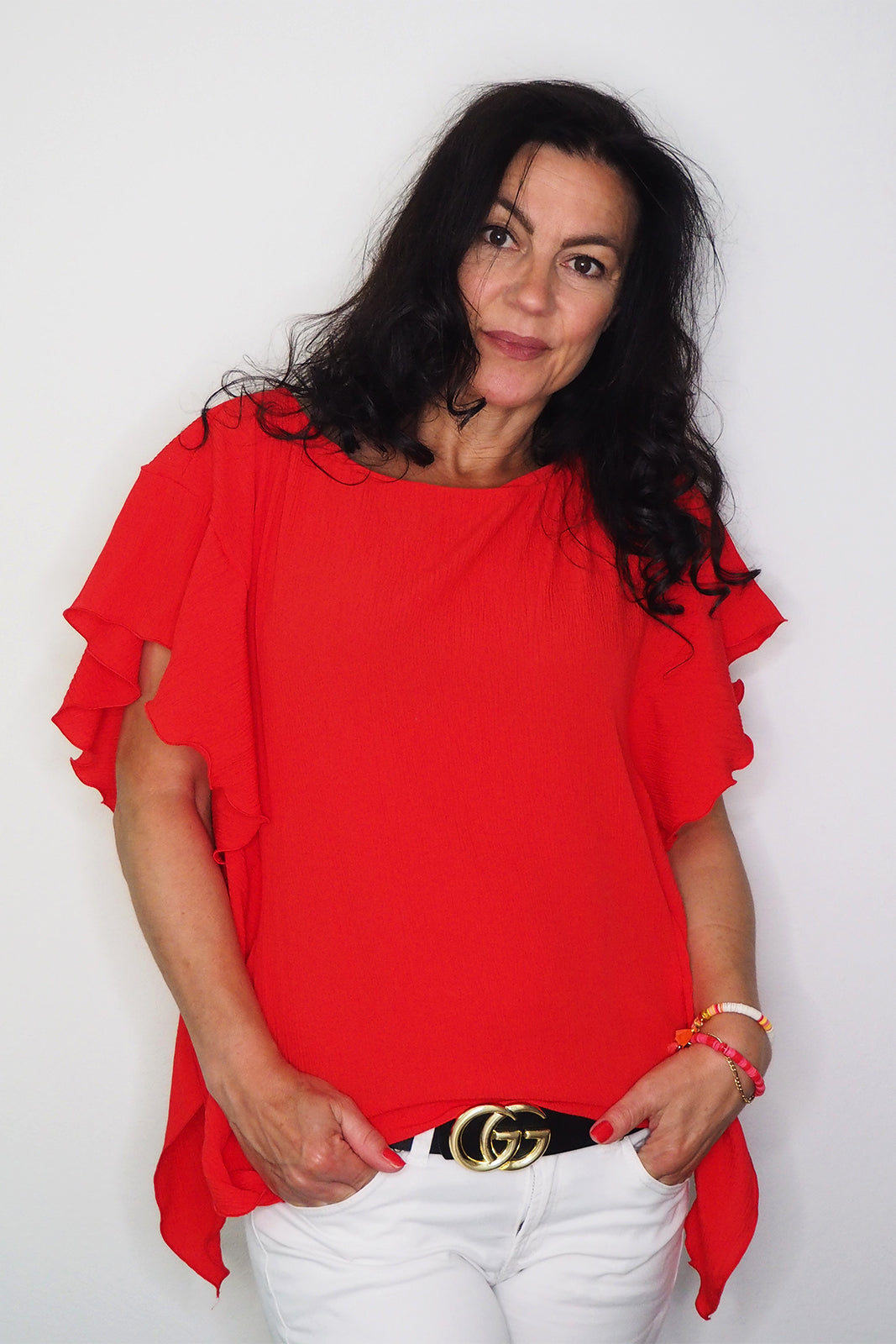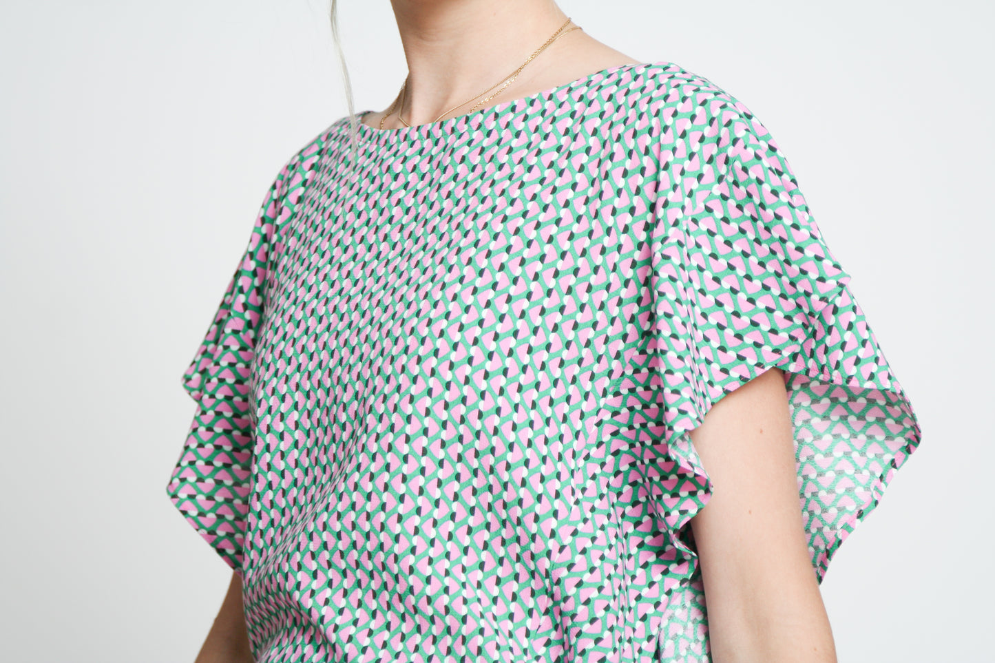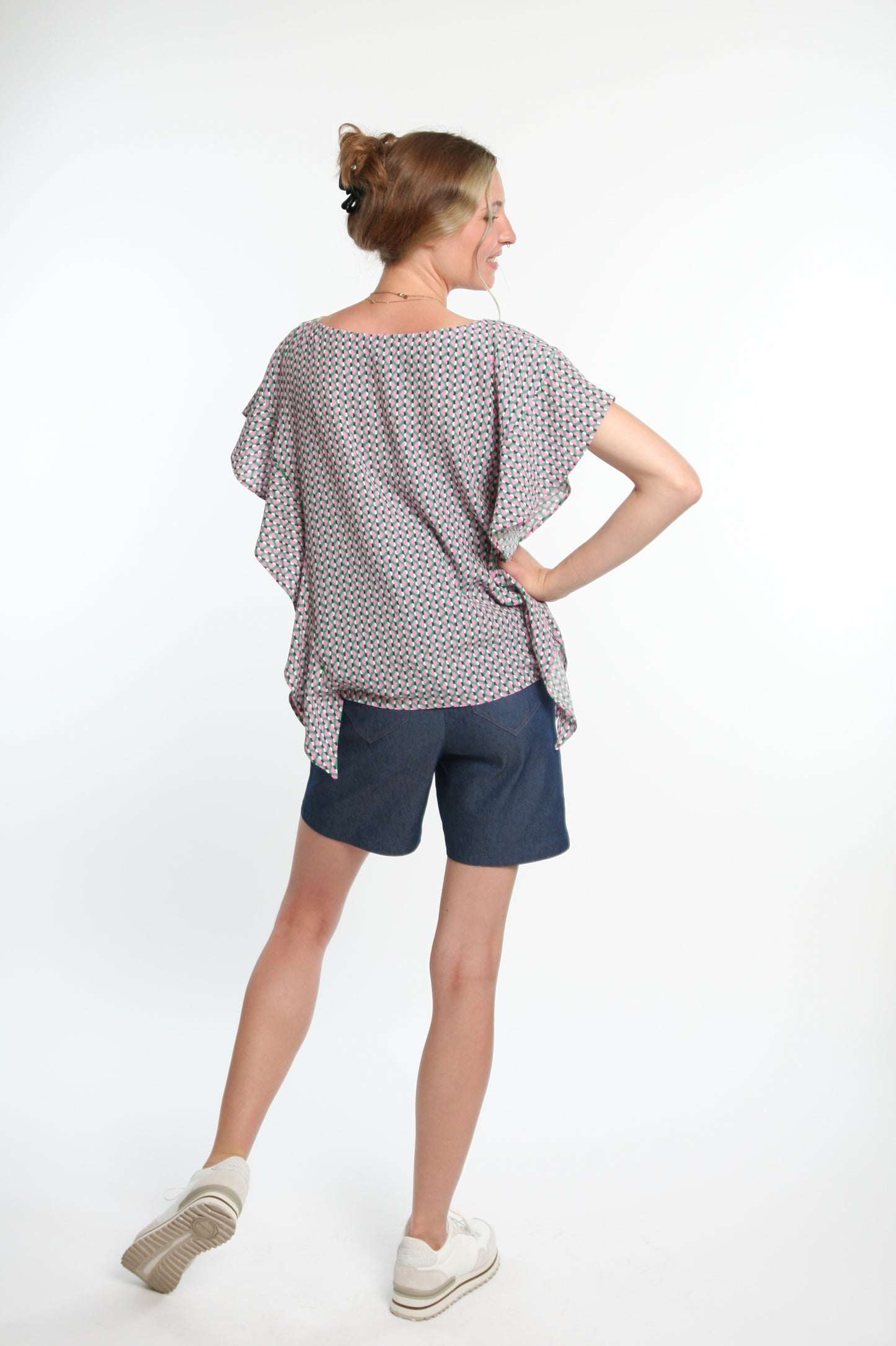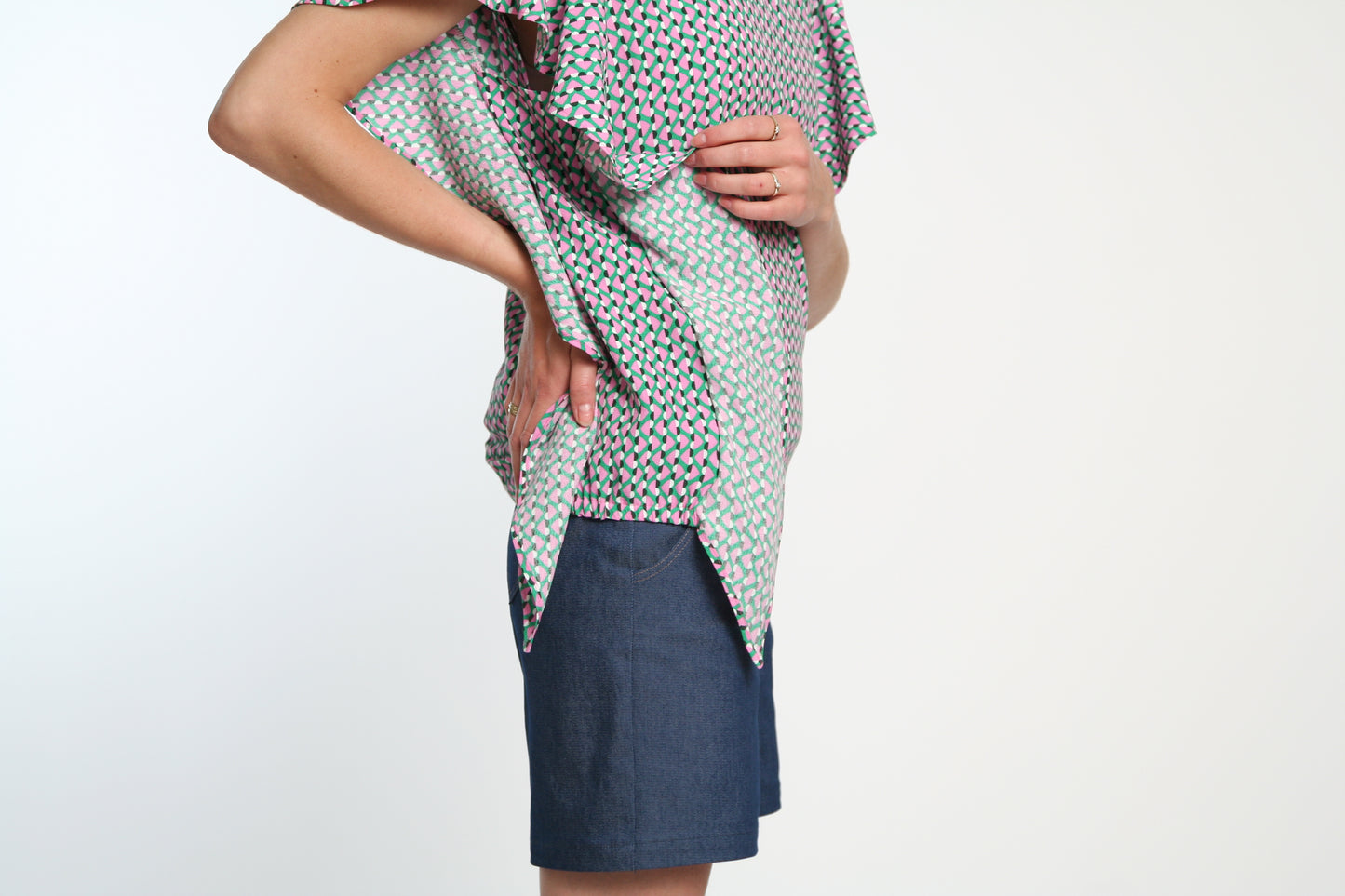The Antonia T-shirt is easy to sew and therefore belongs in our " I'm still learning " category. The sophisticated cut gives the shirt a special look with a hippie character. The ruffle on the side covers the upper arm like a sleeve. The hem is gathered with the help of a narrow elastic band and thus ensures a good fit.