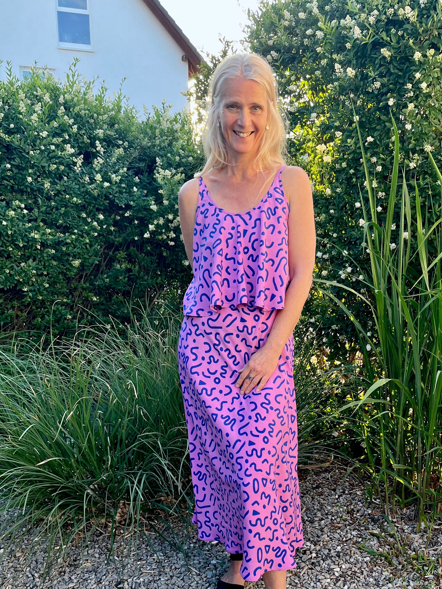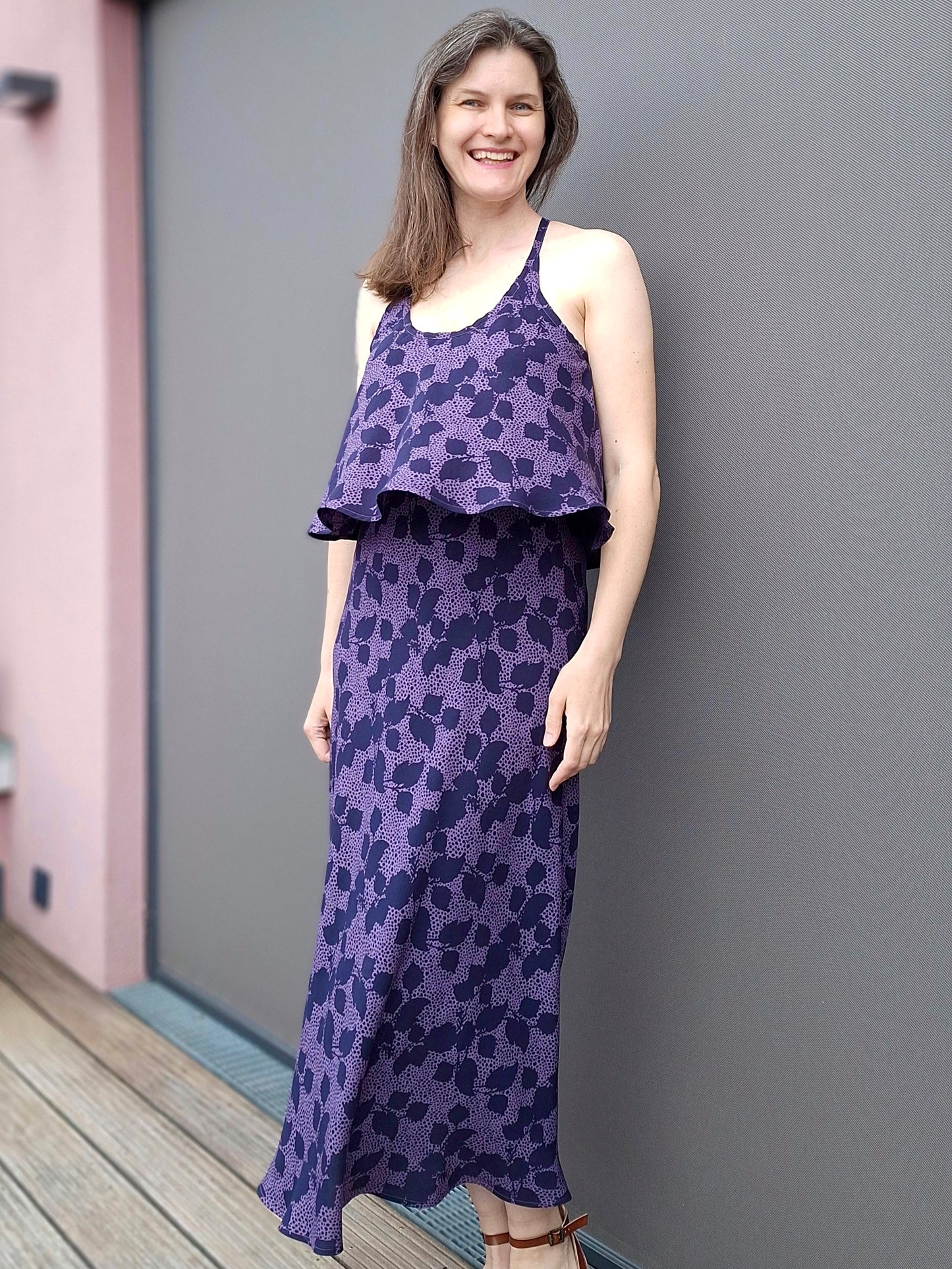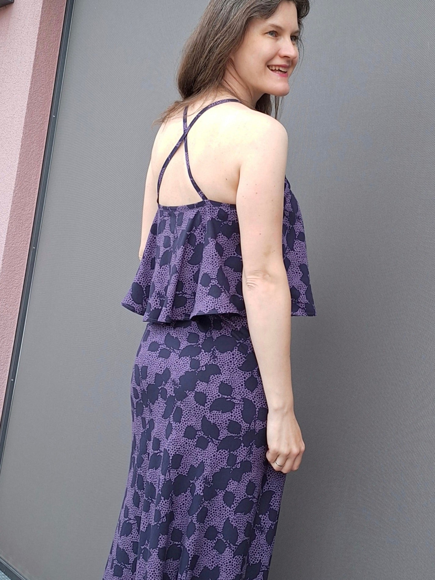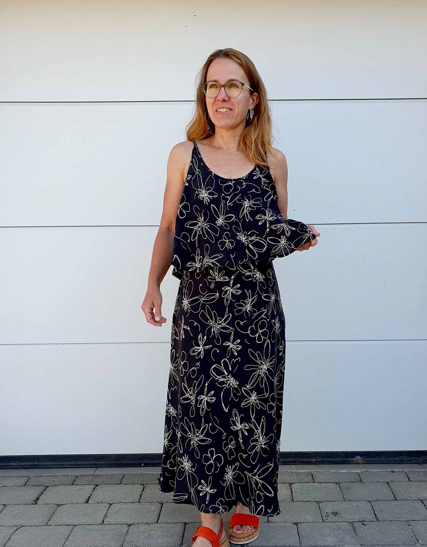 Top und Kleid sind im Ausschnitt miteinander verbunden und mit Schrägstreifen eingefasst. Für die schmalen Träger werden ebenfalls Schrägstreifen verwendet.