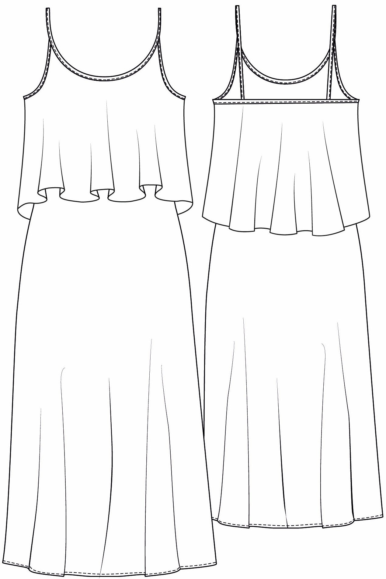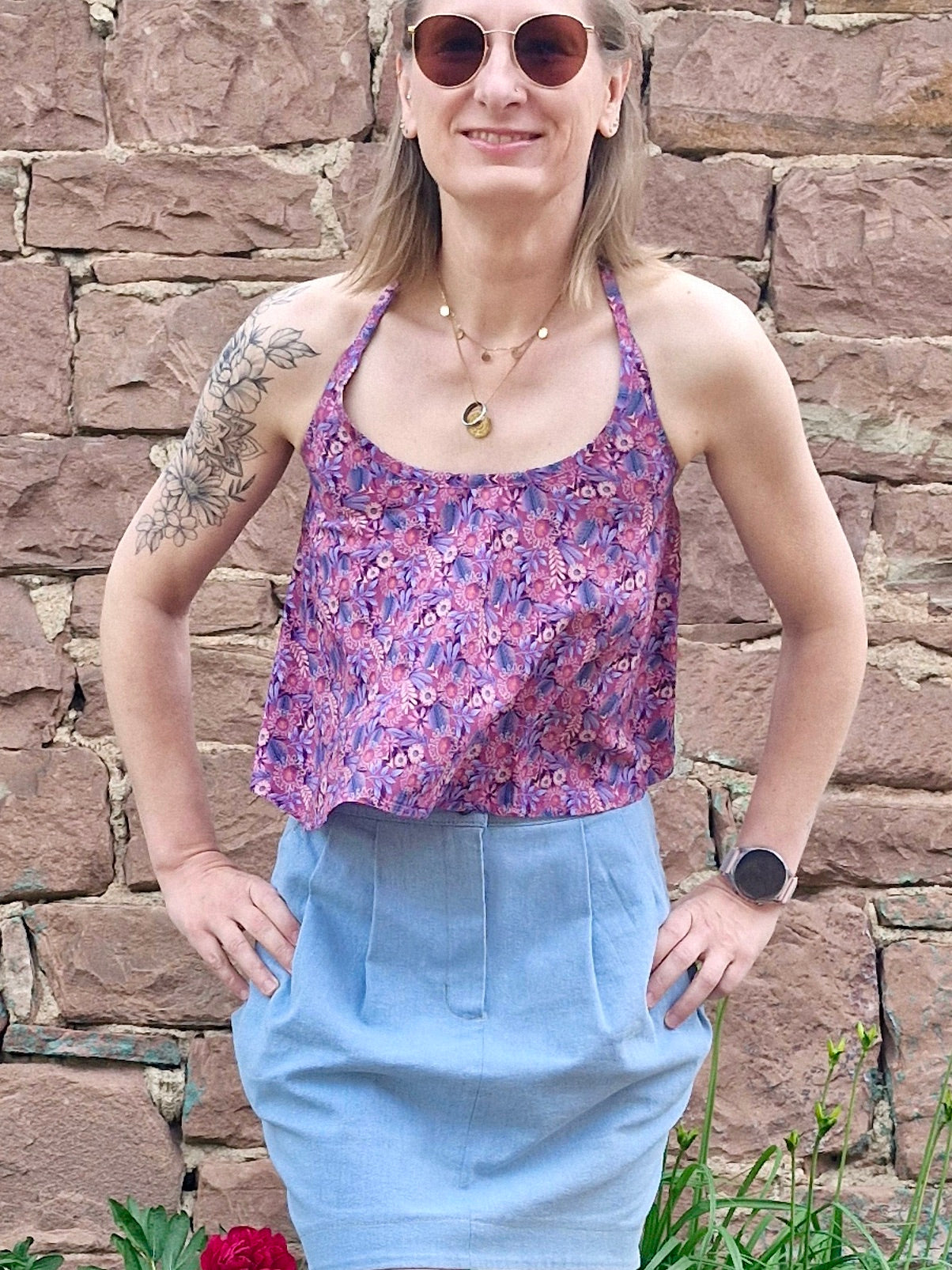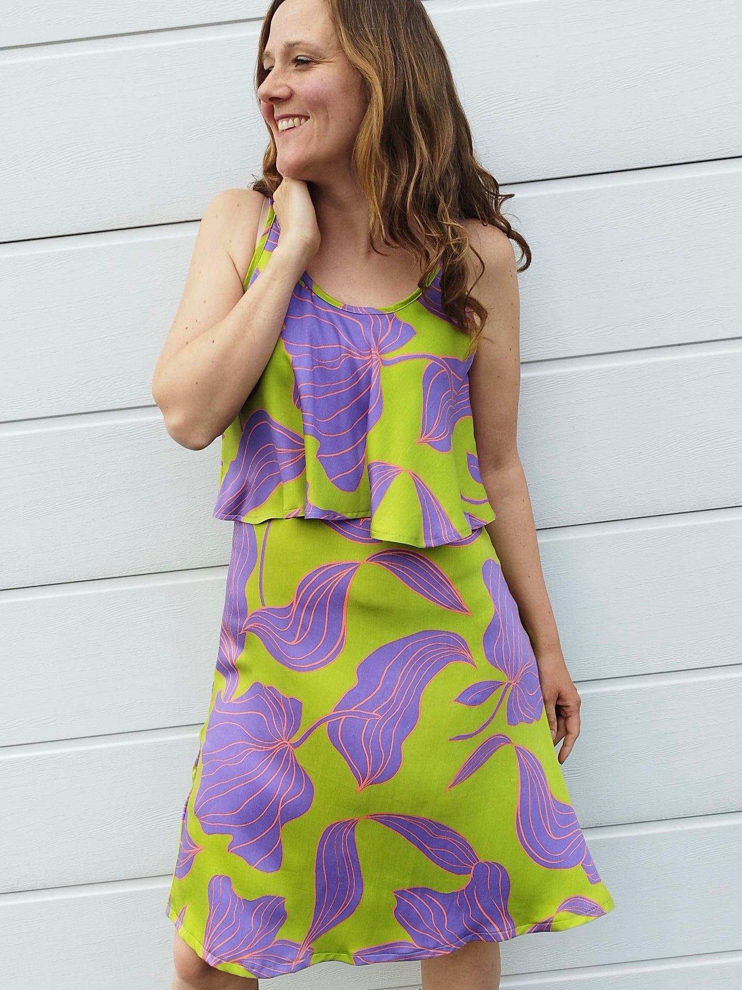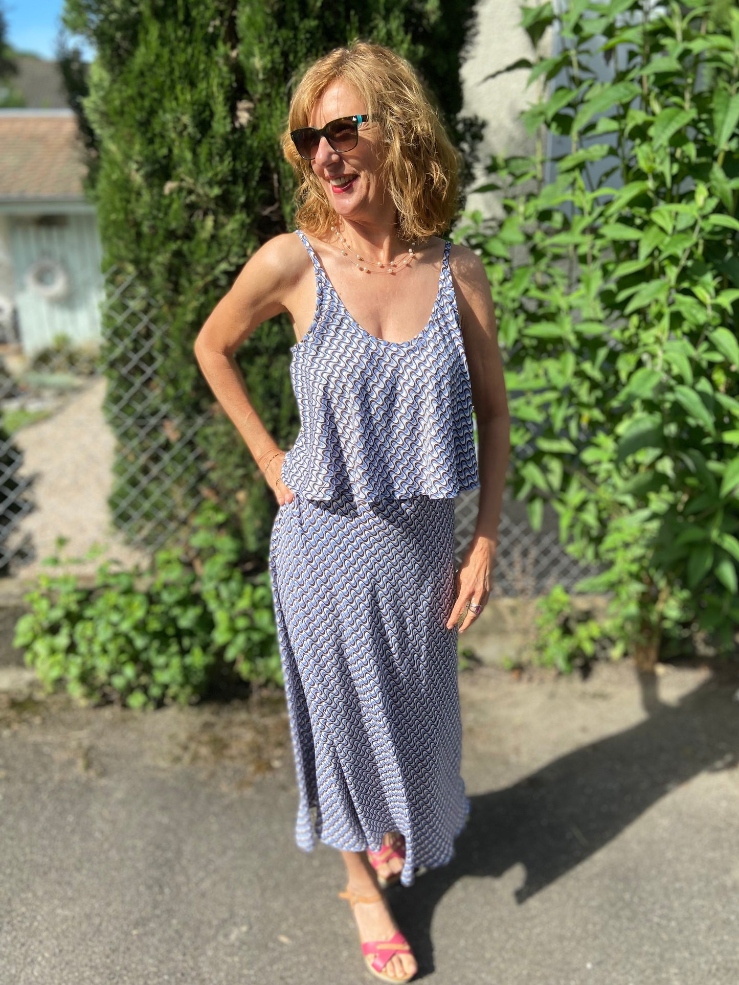 Top und Kleid sind im Ausschnitt miteinander verbunden und mit Schrägstreifen eingefasst. Für die schmalen Träger werden ebenfalls Schrägstreifen verwendet.