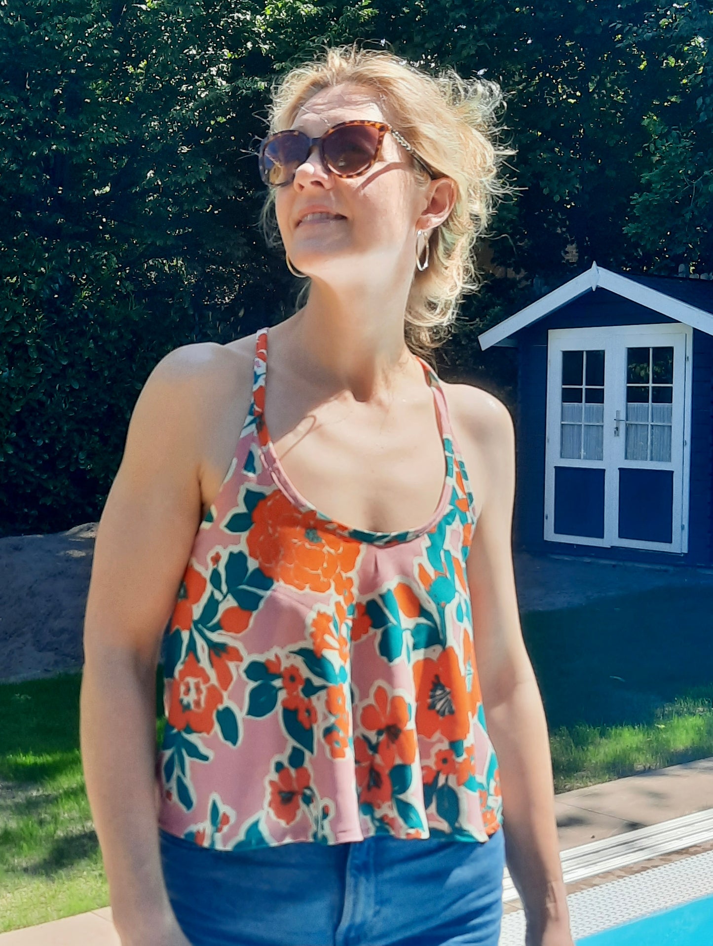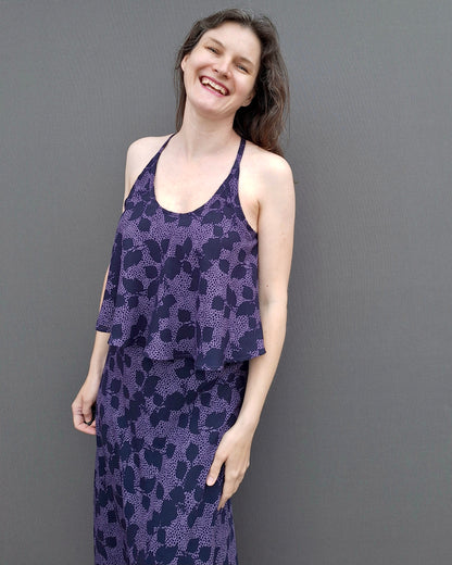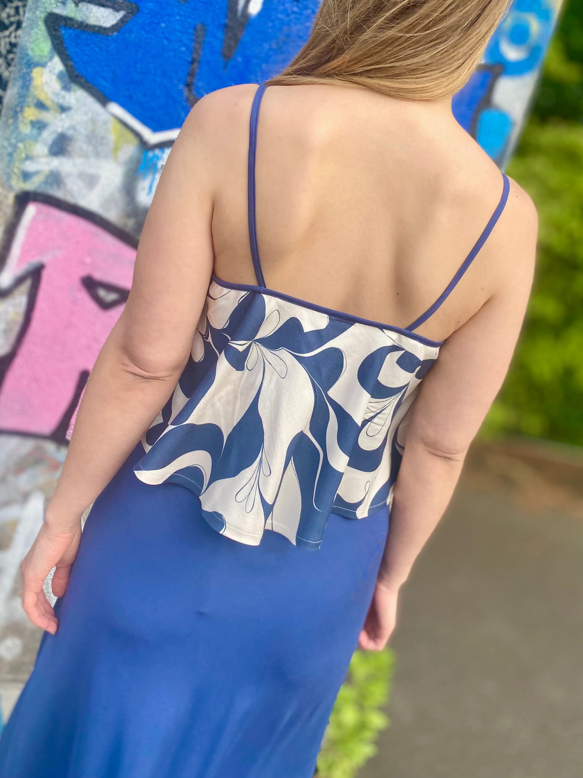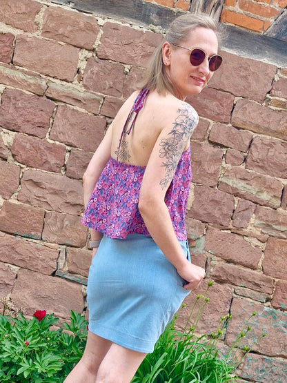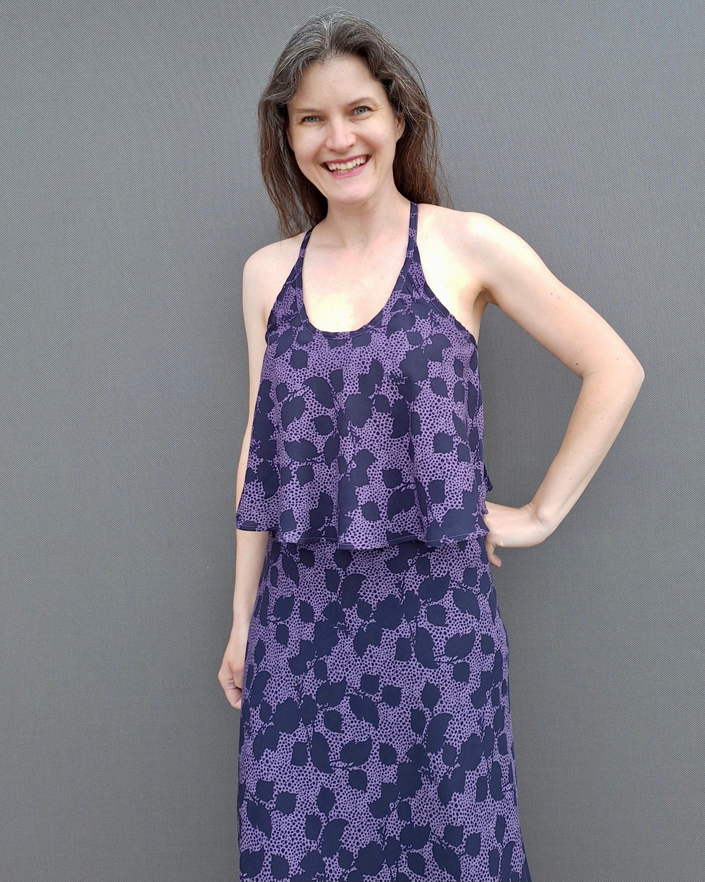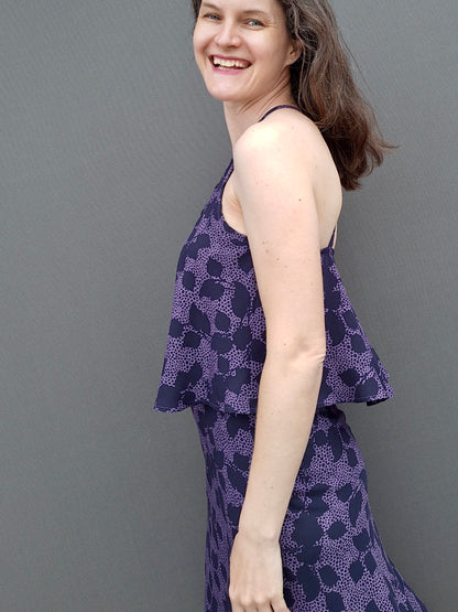 Top und Kleid sind im Ausschnitt miteinander verbunden und mit Schrägstreifen eingefasst. Für die schmalen Träger werden ebenfalls Schrägstreifen verwendet.