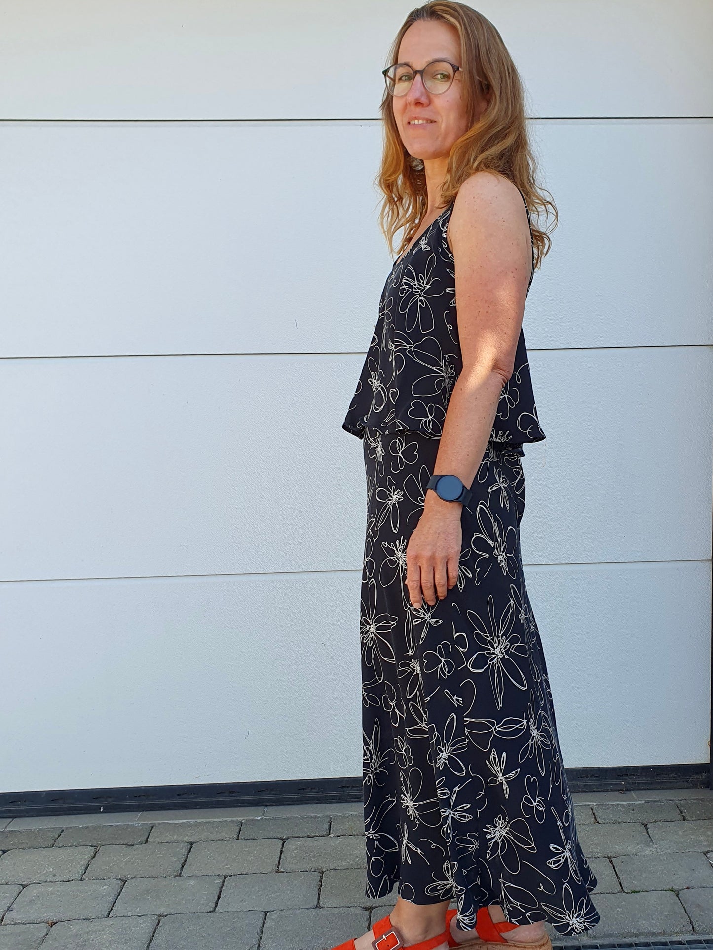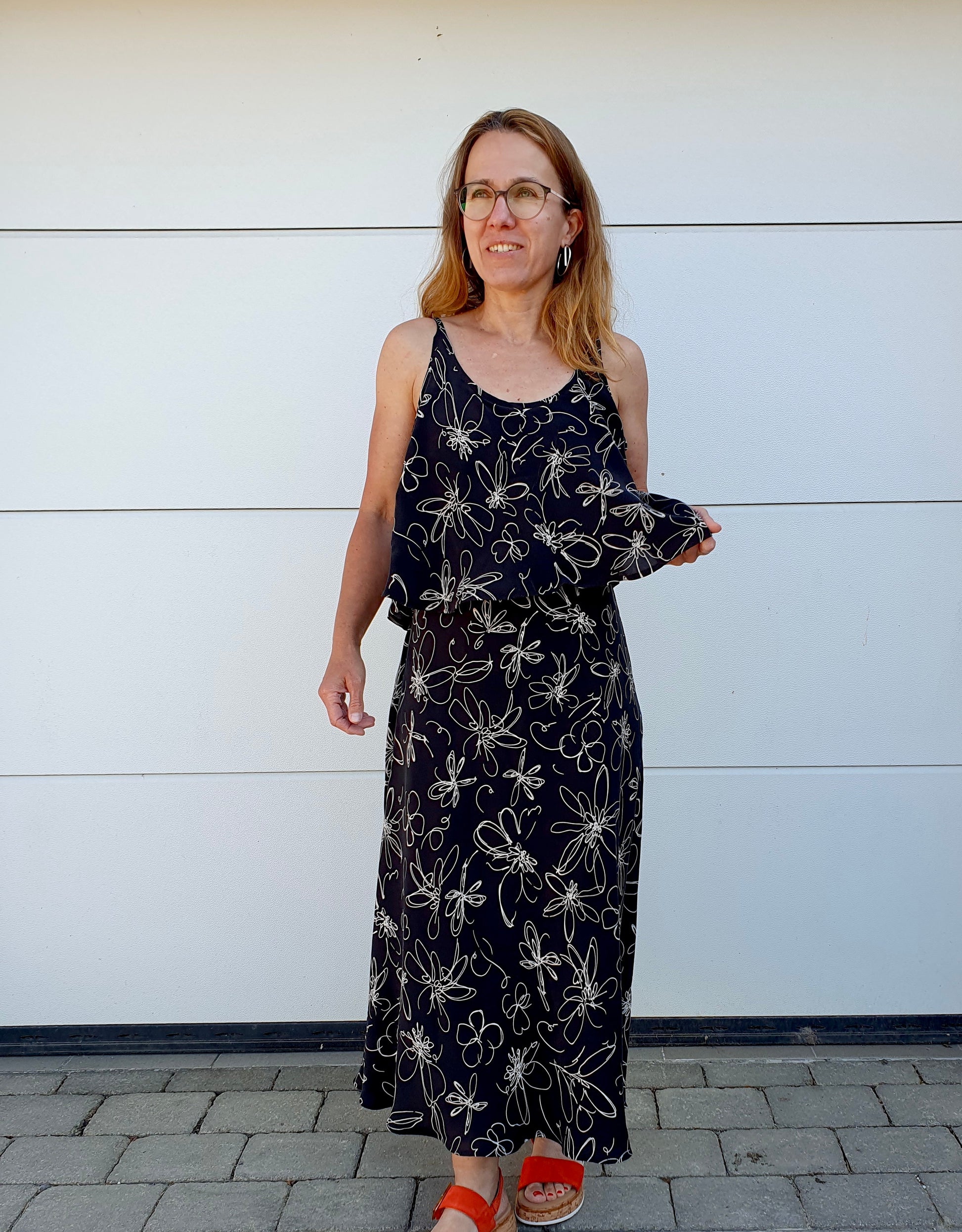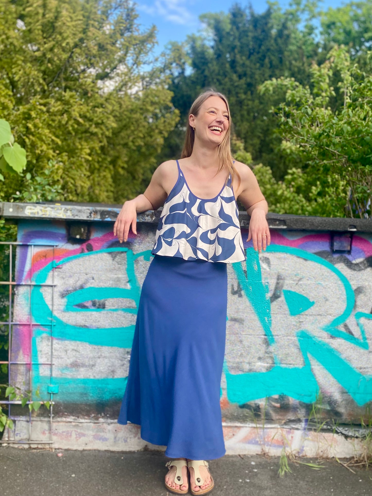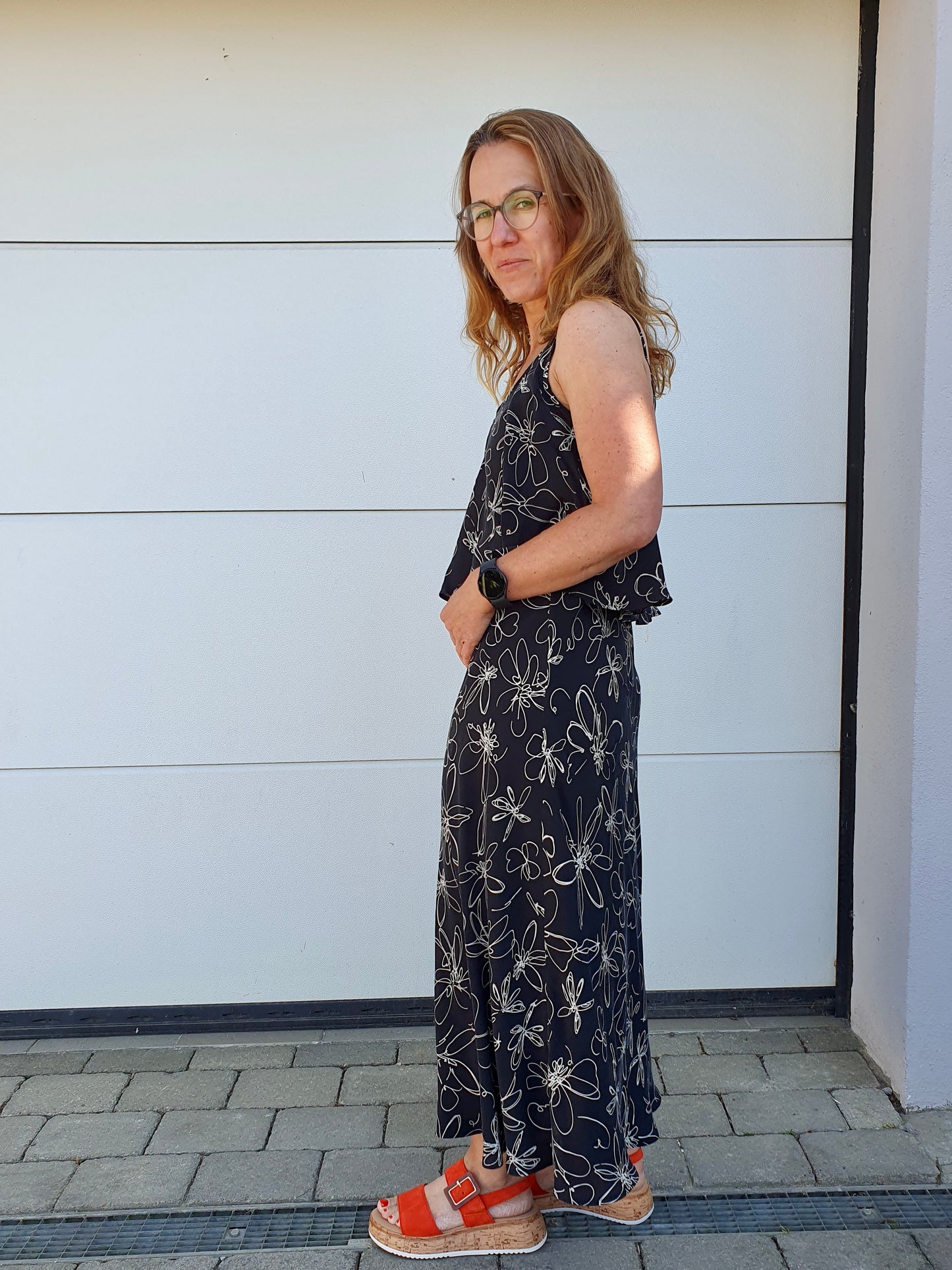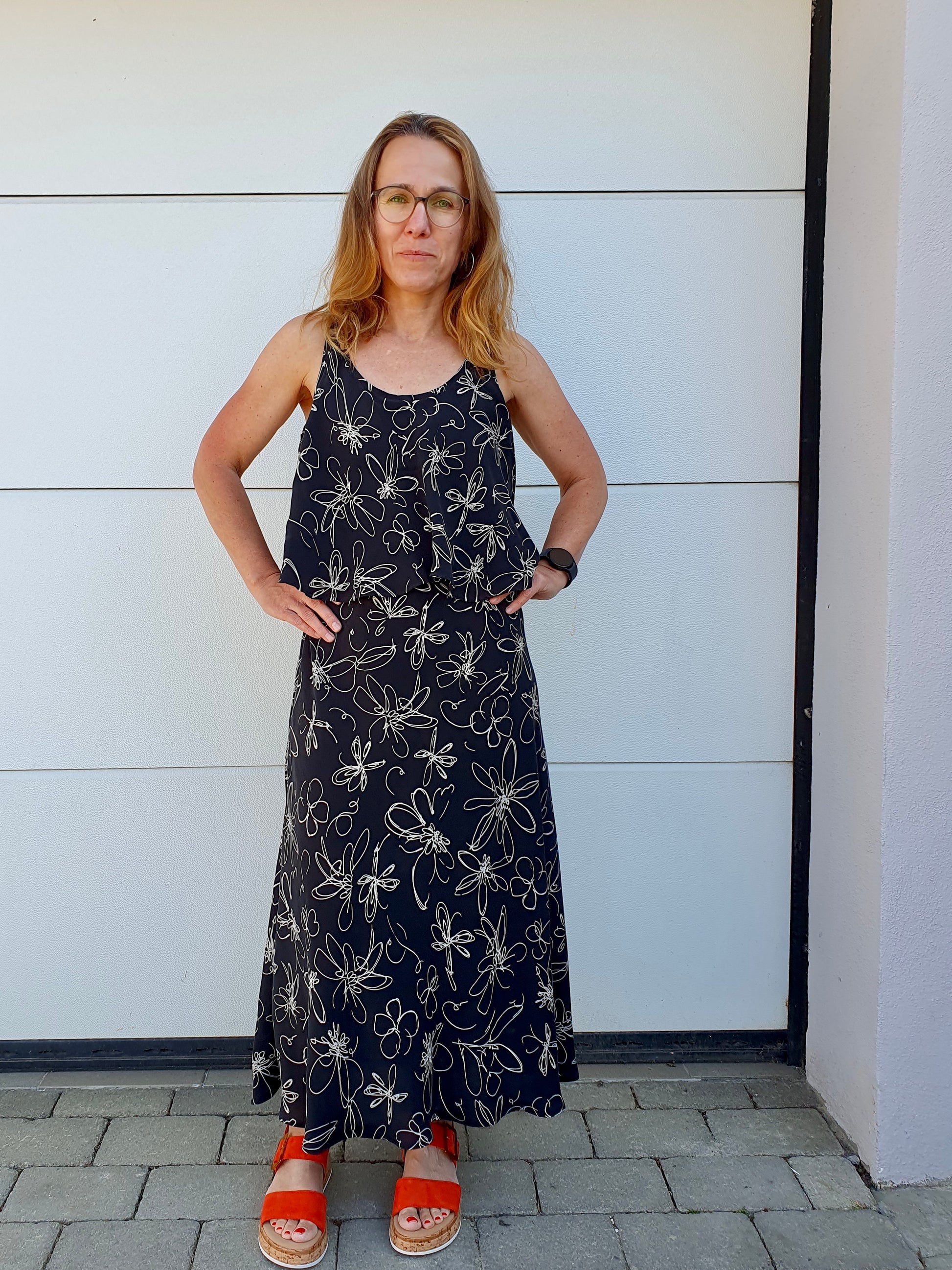 Der ausgestellte Saum des Tops spiegelt sich in der Silhouette des Kleides, denn auch zum Kleidersaum ist der Schnitt aufgedreht.