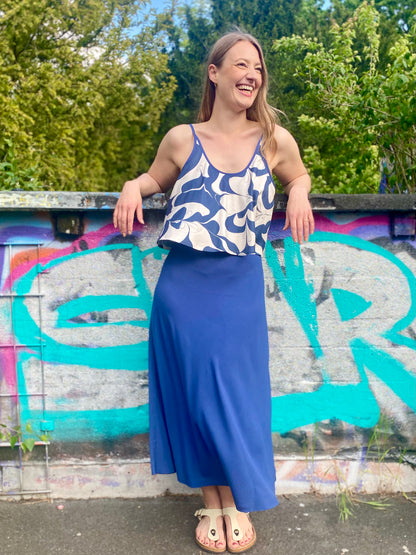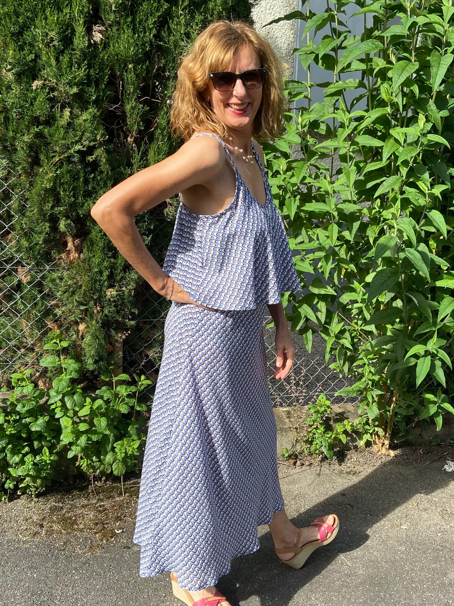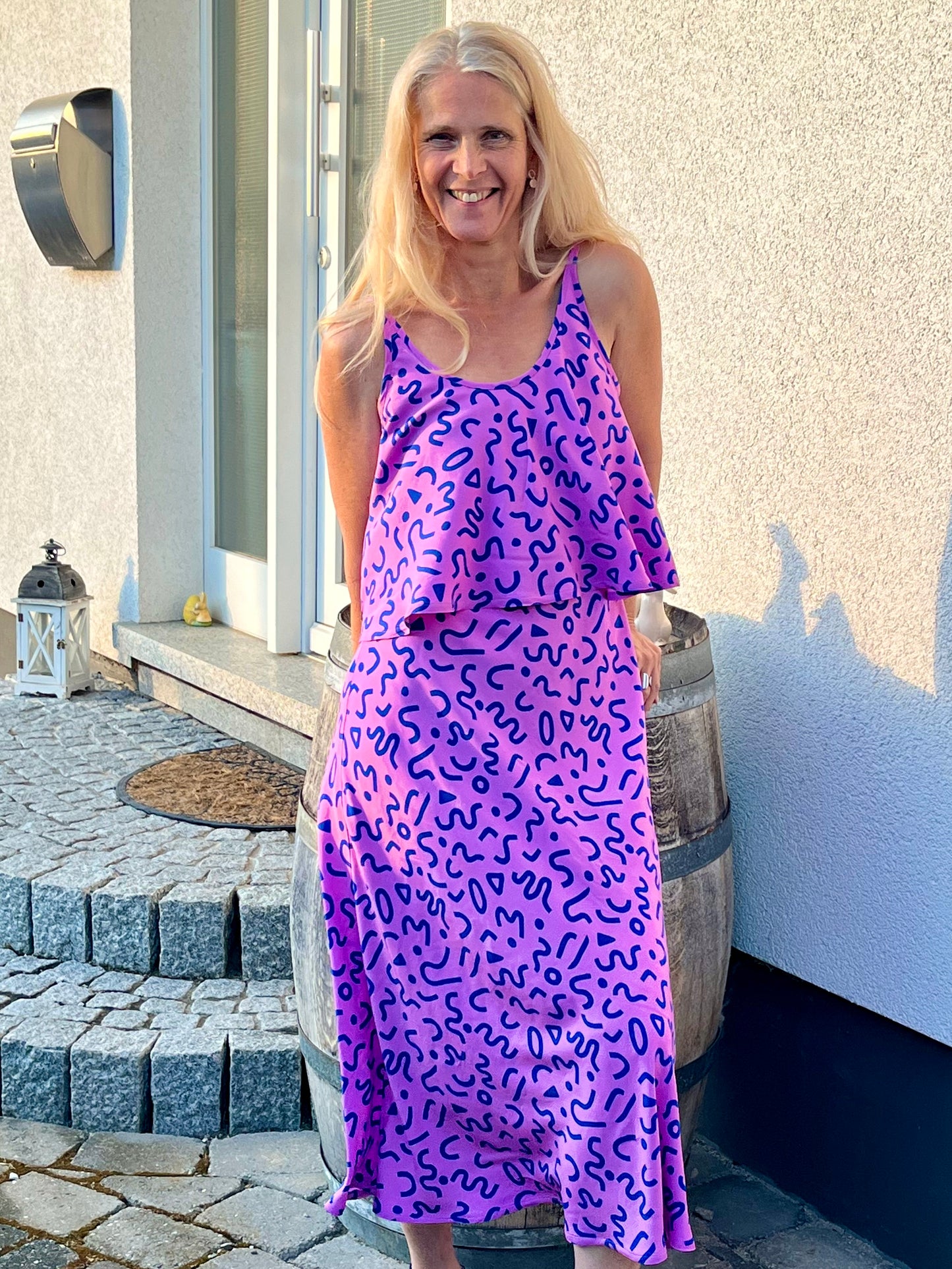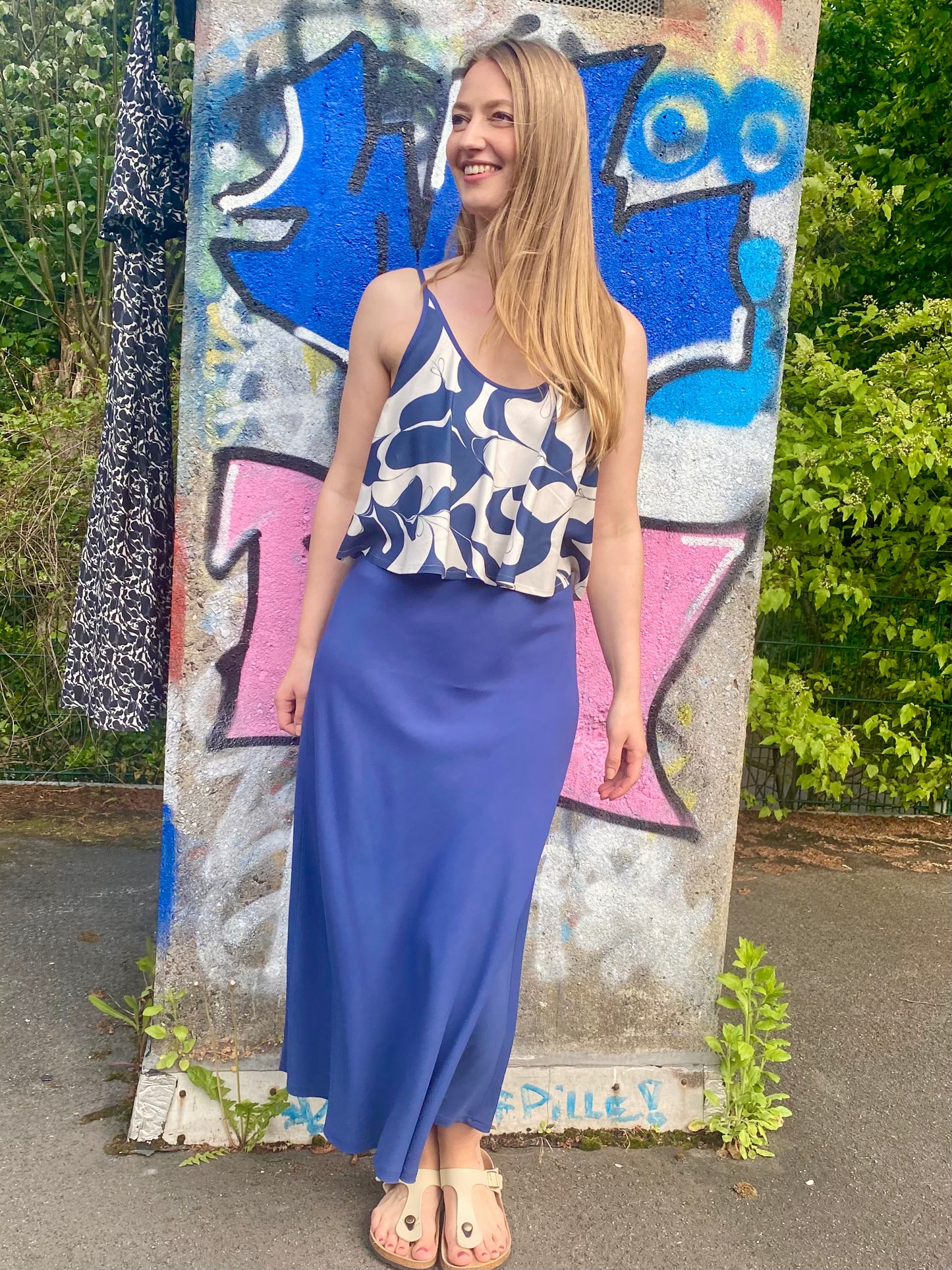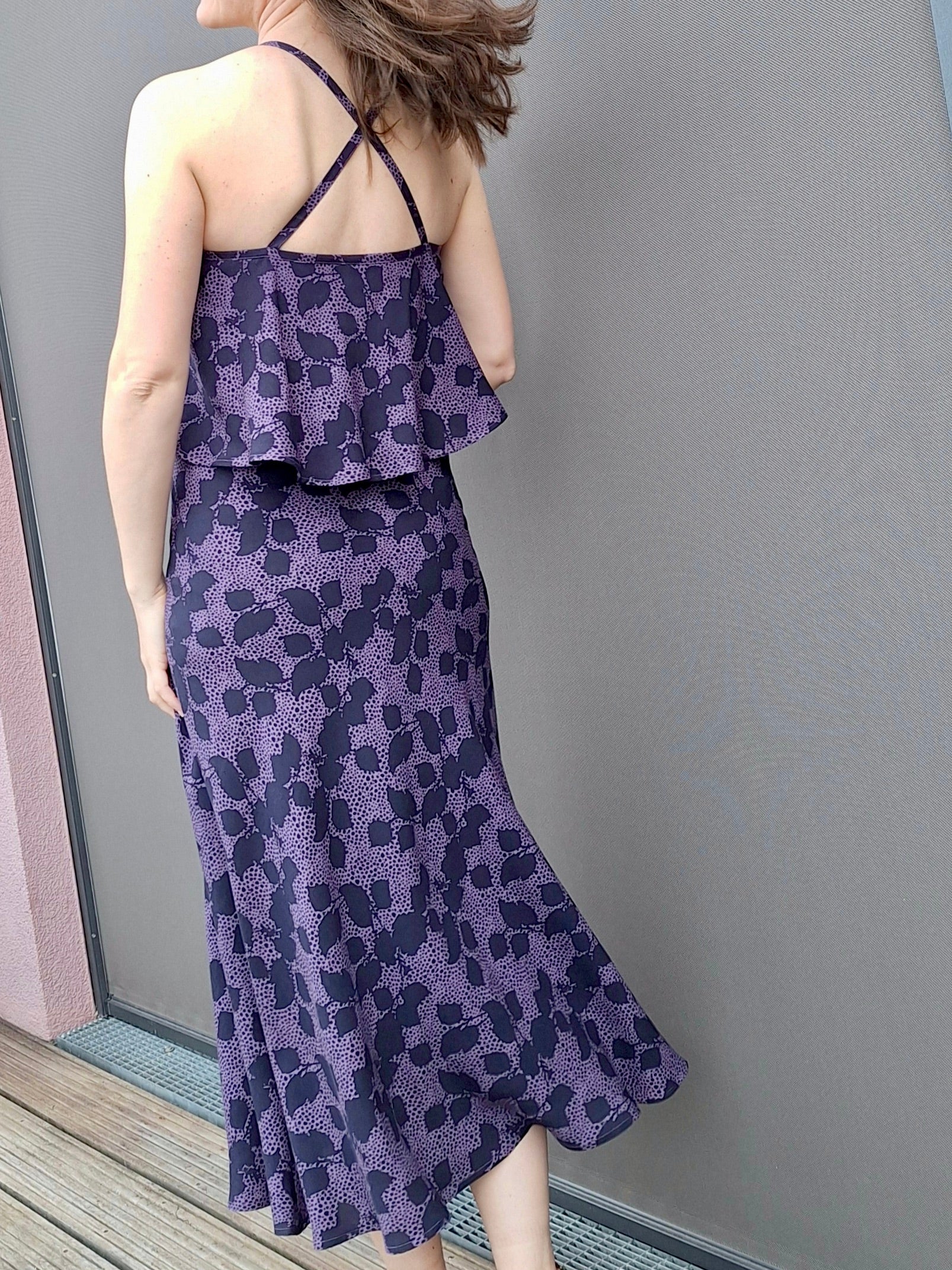 Der ausgestellte Saum des Tops spiegelt sich in der Silhouette des Kleides, denn auch zum Kleidersaum ist der Schnitt aufgedreht.