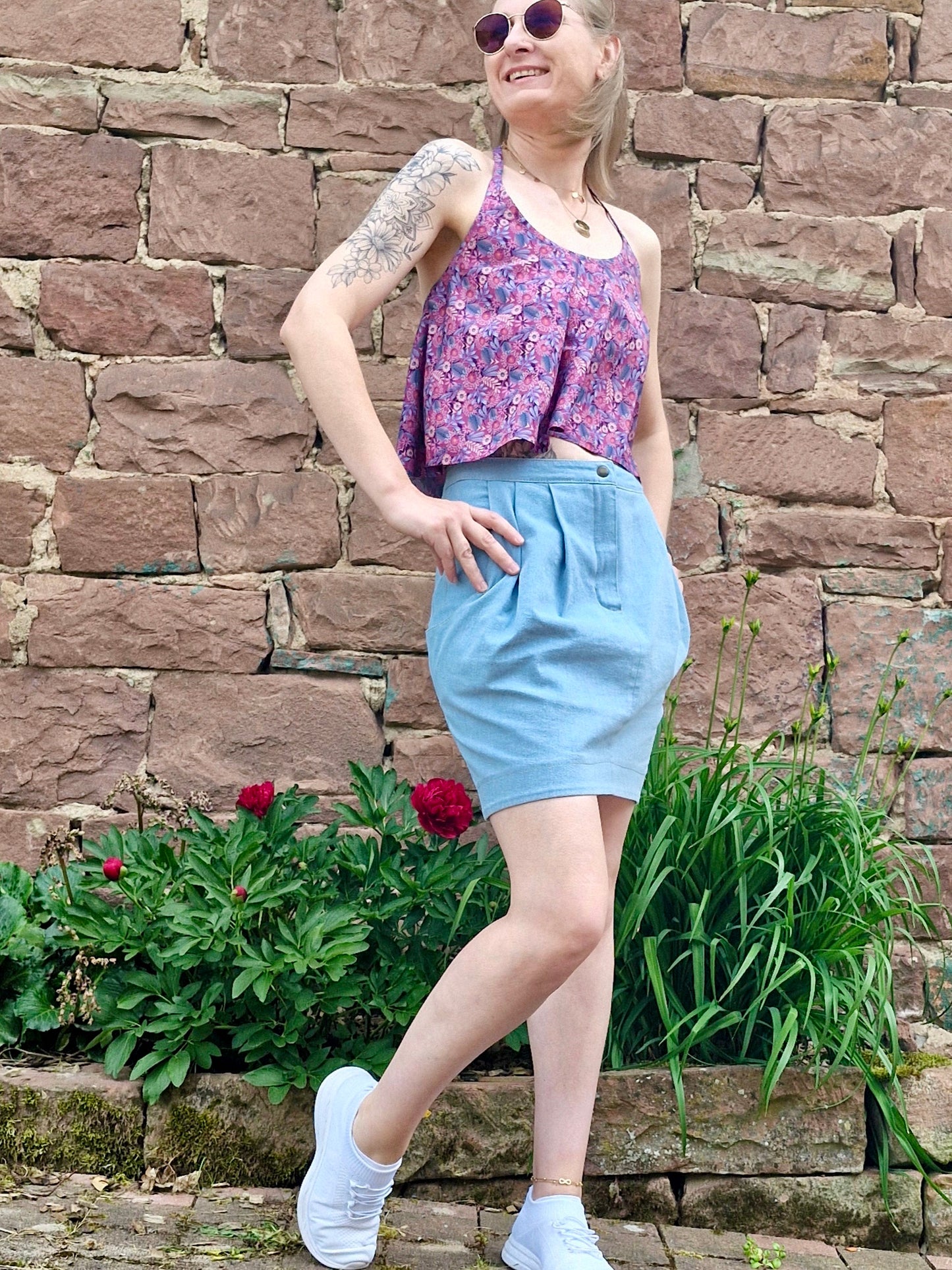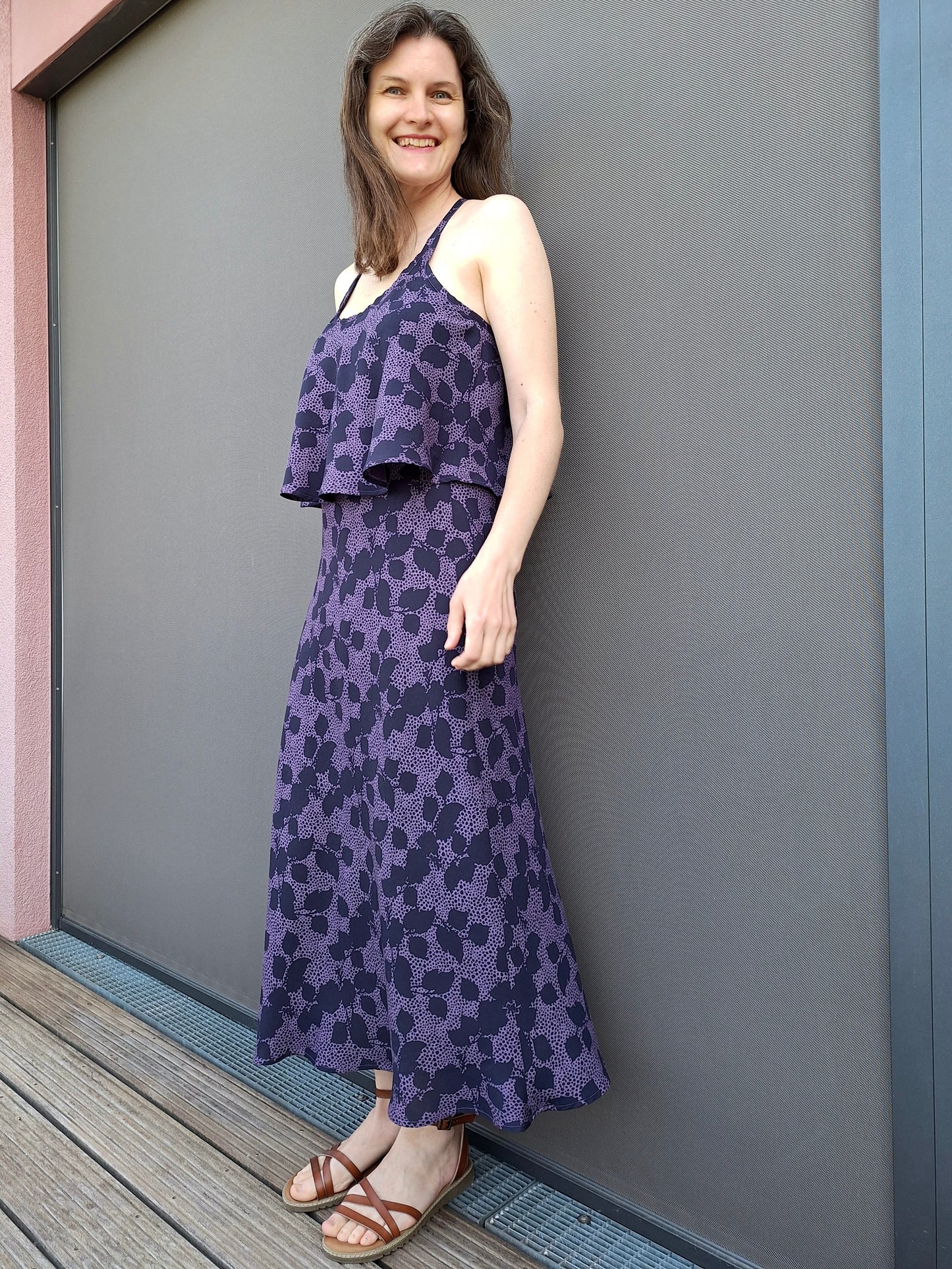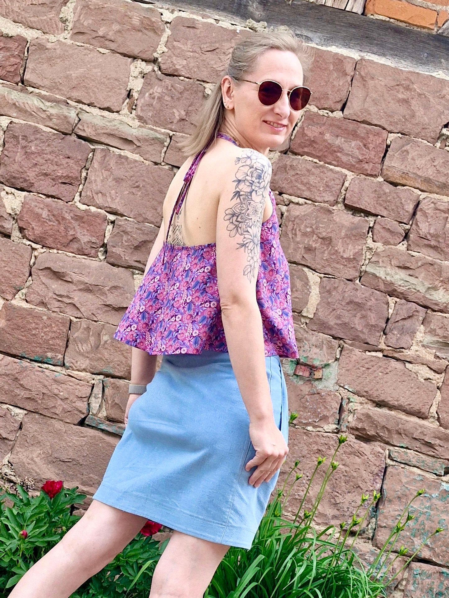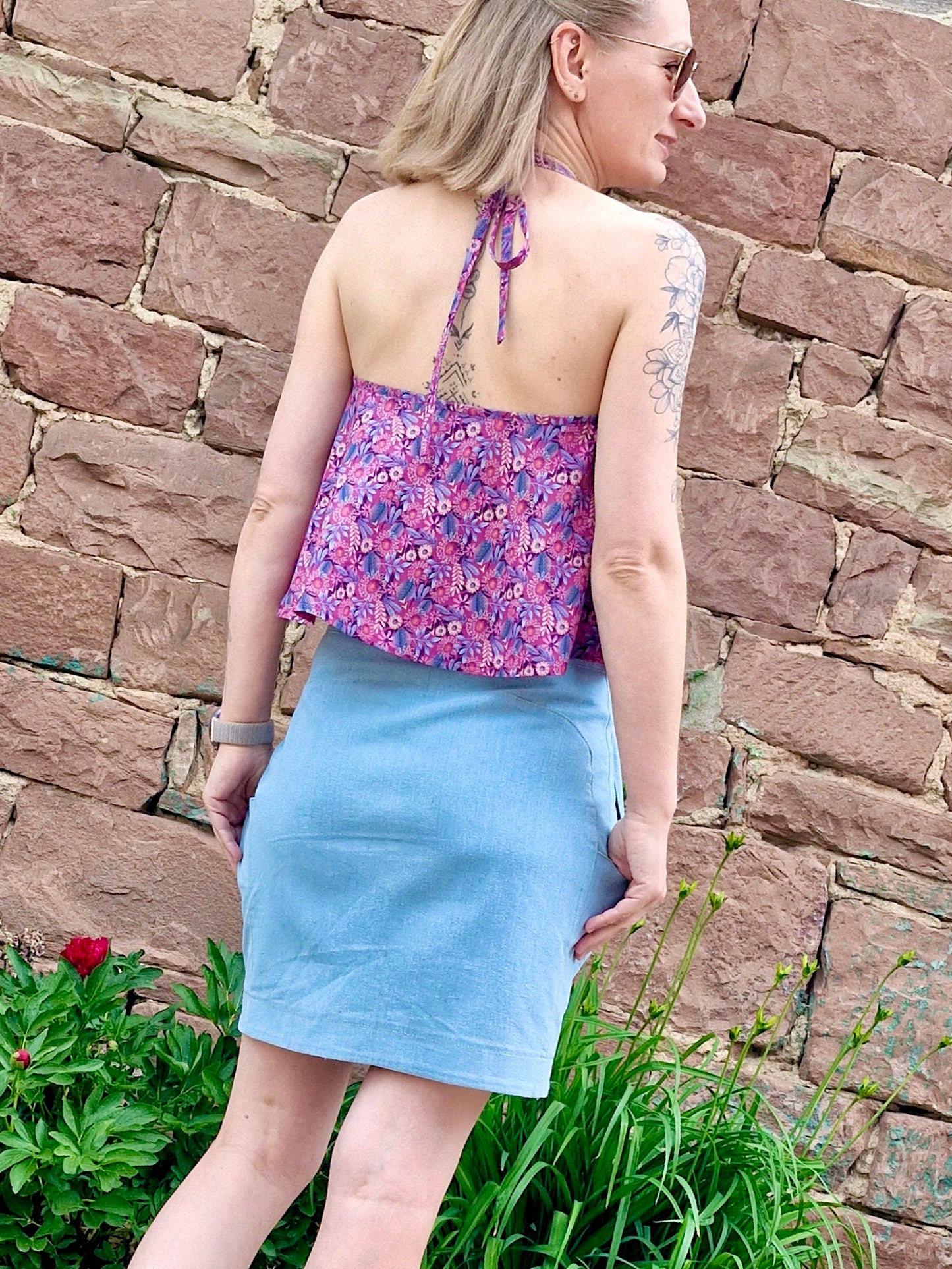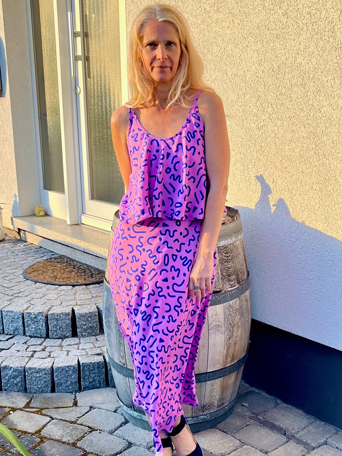 Der ausgestellte Saum des Tops spiegelt sich in der Silhouette des Kleides, denn auch zum Kleidersaum ist der Schnitt aufgedreht.