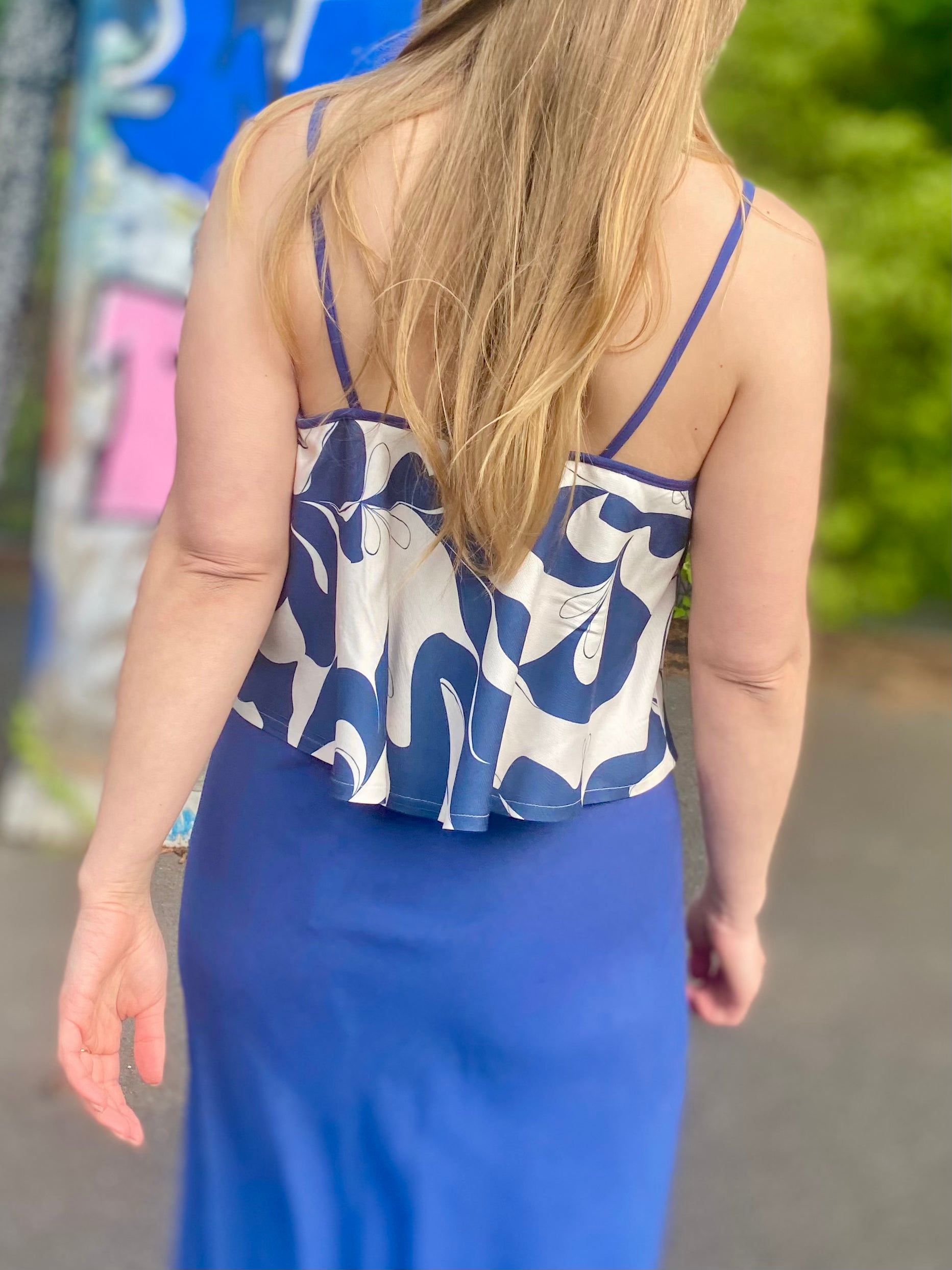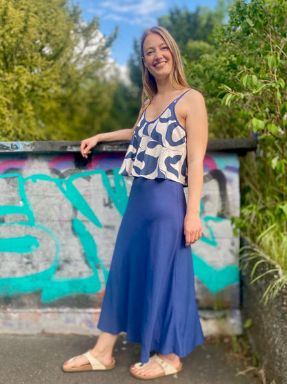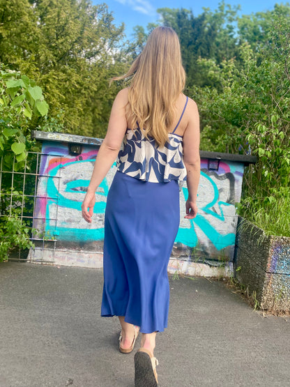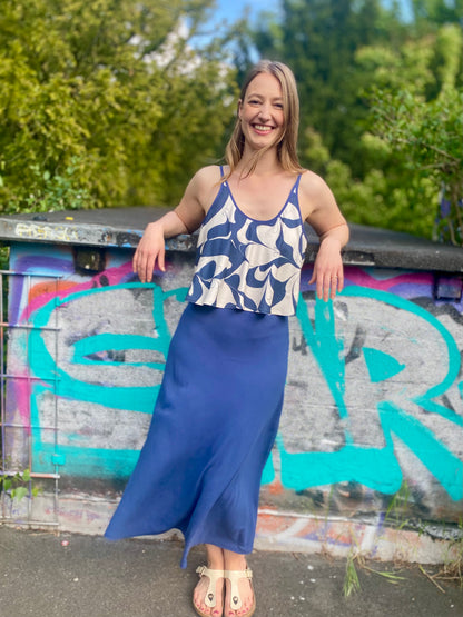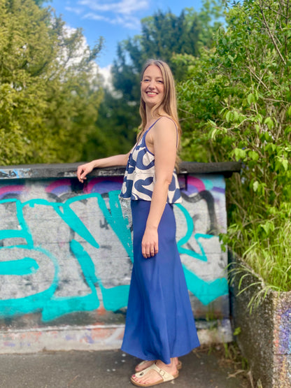 „Bias cut“ (Schrägschnitt) bedeutet, dass das Schnittmuster diagonal zum Fadenlauf (45-Grad-Winkel) zugeschnitten ist, um einen figurnahen, geschmeidigen und eleganten Sitz zu erzielen.